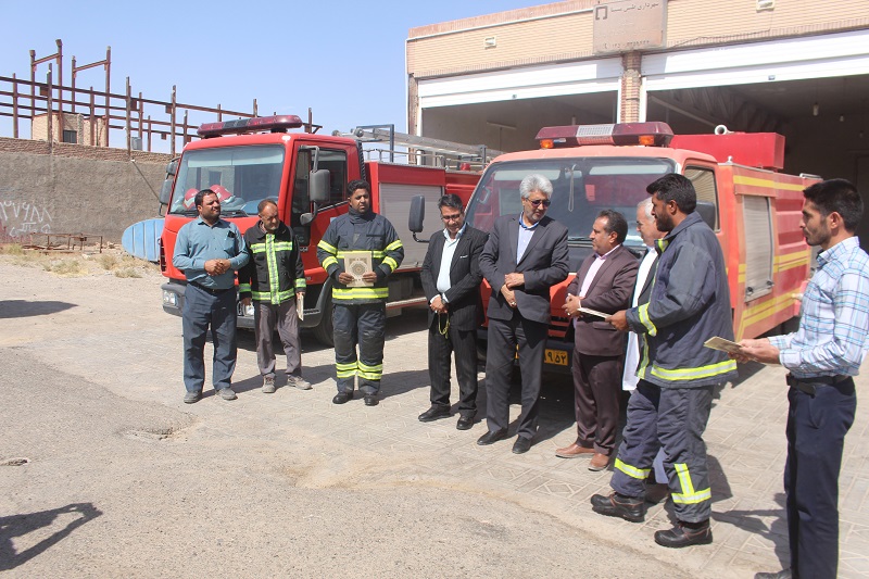 به مناسبت روز ملی آتش نشانی و ایمنی مهندس فرجامی فرد فرماندار شهرستان درمیان با حضور در ایستگاه آتش نشانی ضمن دیدار و گفت و گو ی صمصمی با پرسنل خدوم و عزیز آتش نشانی از تلاش های صادقانه و مجاهدانه ایشان در راستای حفظ جان و مال هموطنان با اهدای لوح تقدیر تجلیل به عمل آورد.